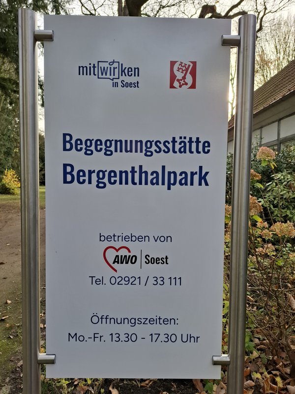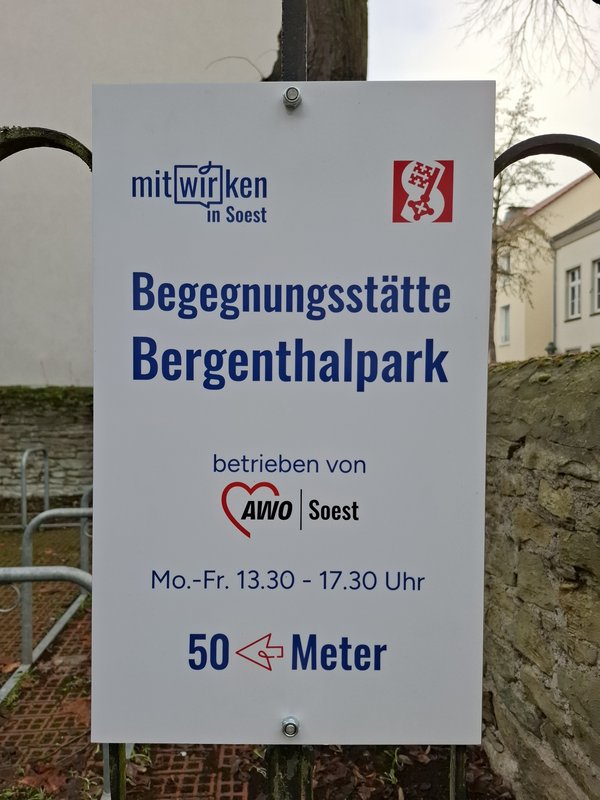 Nach längerer Wartezeit haben wir endlich zwei Informationsschilder im Bereich unserer Begegnungsstätte im Bergenthalpark. Eins steht direkt vor der Begegnungsstätte und eins hängt an der Nöttenstraße mit Entfernungsangabe. Wir freuen uns, dass man den AWO-Ortsverein Soest jetzt noch schneller findet.